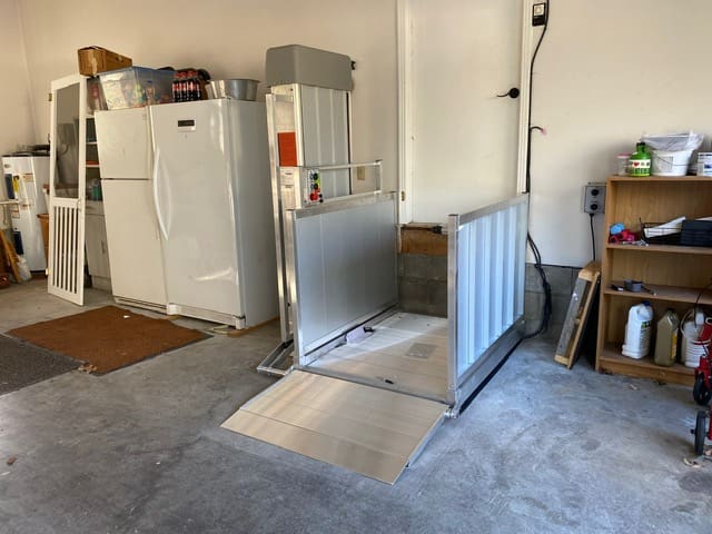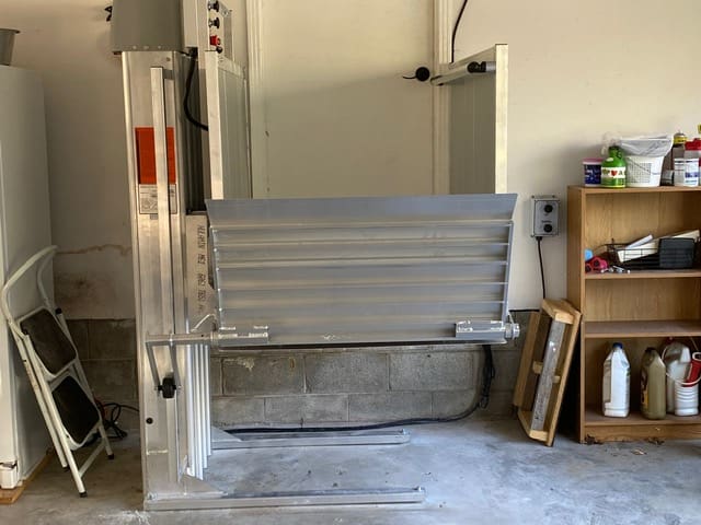 Number Three: Vertical platform lift or small elevators as they are sometimes called can be very useful to access a home where an individual is in a wheelchair or power mobility device full-time. The most common area where the vertical platform lift is used is in a garage, next to a porch or a back deck. They come in multiple heights and allow people to bring their power mobility device onto a platform, push a button and take them to the destination so they can easily access their home. The lifts have a 750 to 850 pound weight capacity which allows the individual, the power mobility device and one other person to fit on these platforms. Multiple call buttons can be added if there are more than two individuals that need to use the platform. The average footprint for a vertical platform lift is 4’ x 6’ so they don’t take up a lot of room.