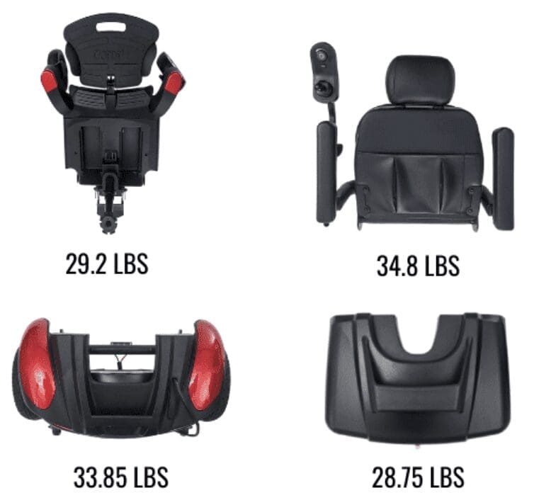 The BuzzAbout Power Wheelchair is a full size option with a weight rating of 300lbs. When it is assembled, it weighs 155 lbs but, in just a matter of minutes, you can break it into 4 parts and stow it in the trunk of the car.