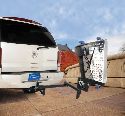 Outside vehicle lifts attach to the vehicle with the use of a trailer hitch. Depending on the lift, you will need either a class II or Class III trailer hitch. Inside mounted vehicle lifts do exactly that. They attach to the inside of your vehicle and are bolted to the floorboard.