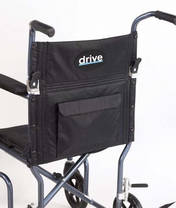 A black transport wheelchair with a pocket on the backrest and drive logo. The wheelchair has metal frames, foldable footrests, and four wheels designed for easy mobility. The setting is a plain, light-colored background.
