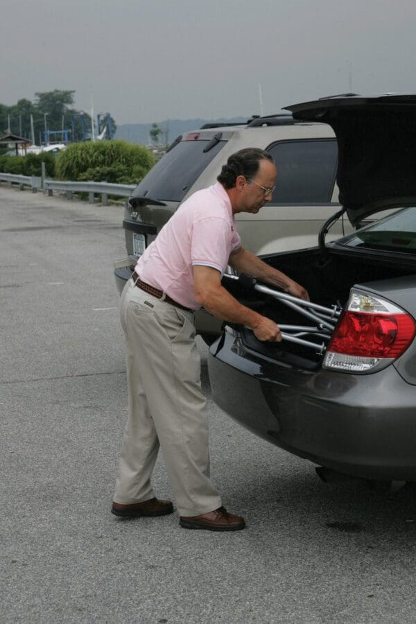A man wearing a pink shirt and beige pants is placing a folding chair into the trunk of a gray car in a parking lot. The background shows greenery and parked vehicles.