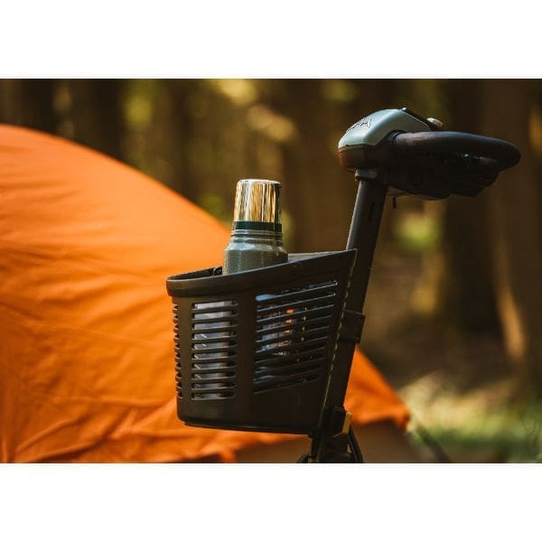 • Sale! A three-wheeled mobility scooter features a mesh backrest, black seat, and small front basket. With handlebars and FDA Class II Medical Device labeling, its compact design is perfect for personal transportation. For more details, check out our FAQ on mobility scooters.