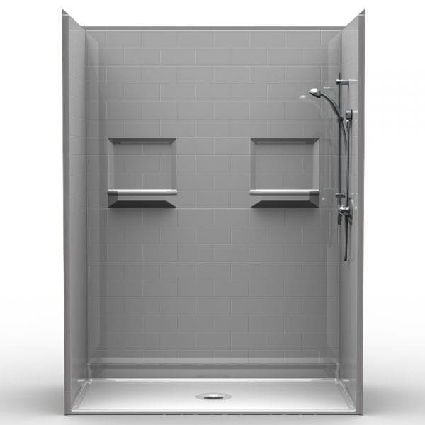 Five piece white 60″ x 32″ barrier free shower with .75 inch beveled threshold and center, left or right drain. Fiberglass shower with Subway Tile look. Luxurious polyester gelcoat finish. Full plywood backing on all walls for outstanding strength and customized installation of accessories. No mud setting required. Accessory package includes: 24″ Stainless Steel safety bar, 48″ Stainless Steel safety bar, 22″ x 16″ padded seat w/legs, Symmons shower valve w/hand held shower system, 2″ caulkless brass drain w/chrome screen, 59.5″ curtain rod /brackets and rings, 66″ x 74″ 20ga vinyl shower curtain, and 5′ WaterStopper.