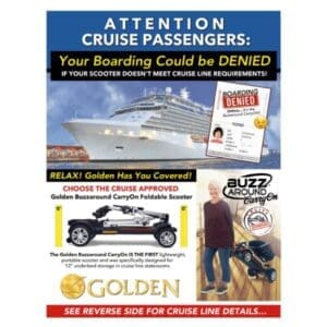 Take your mobility anywhere with the Golden Technologies Buzzaround CarryOn Travel Scooter — the compact, airline-approved scooter built for life on the go. Whether you’re cruising through airports, boarding a ship, or running daily errands, this ultra-portable scooter combines freedom, durability, and all-day comfort in one sleek design.