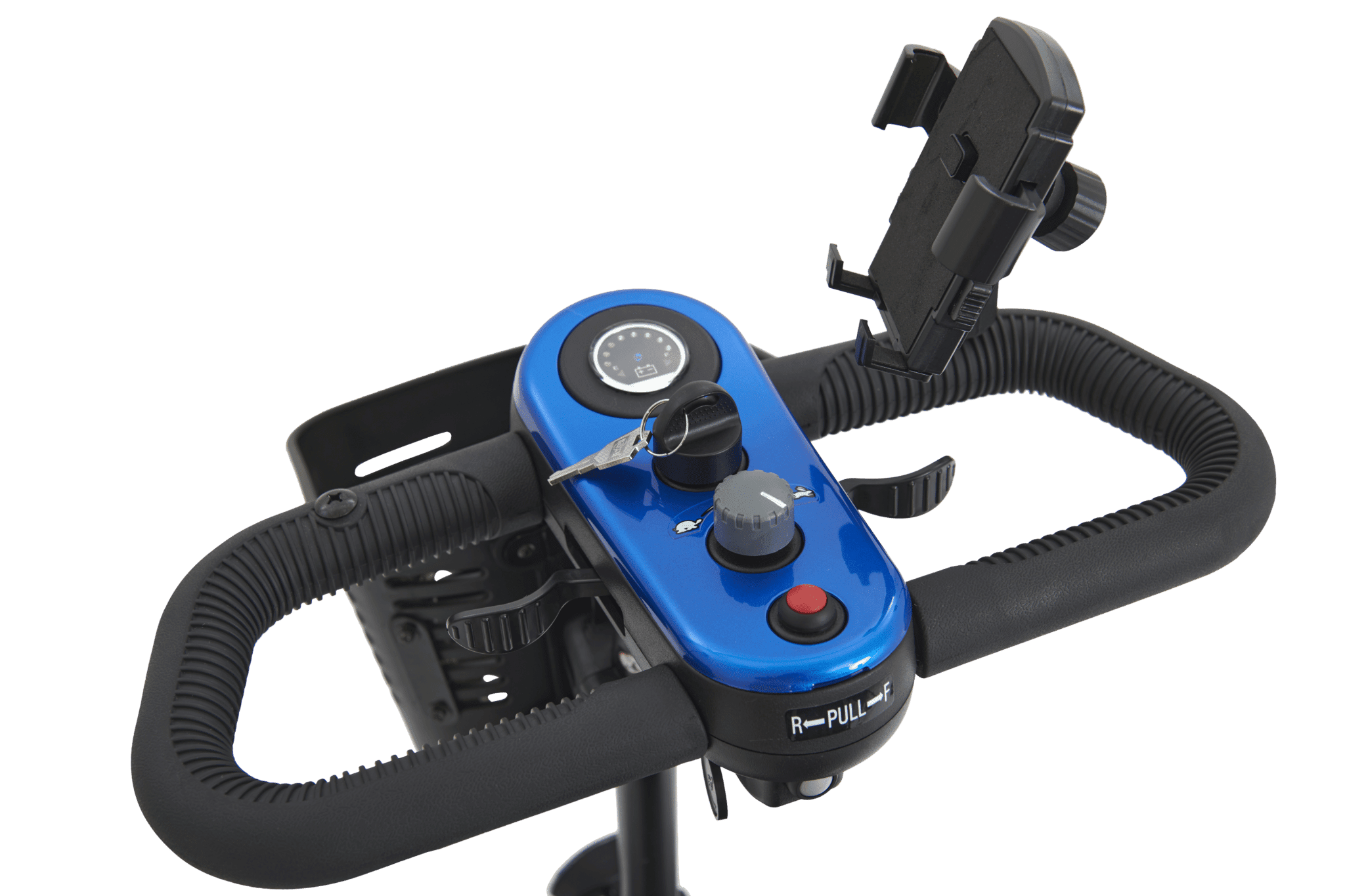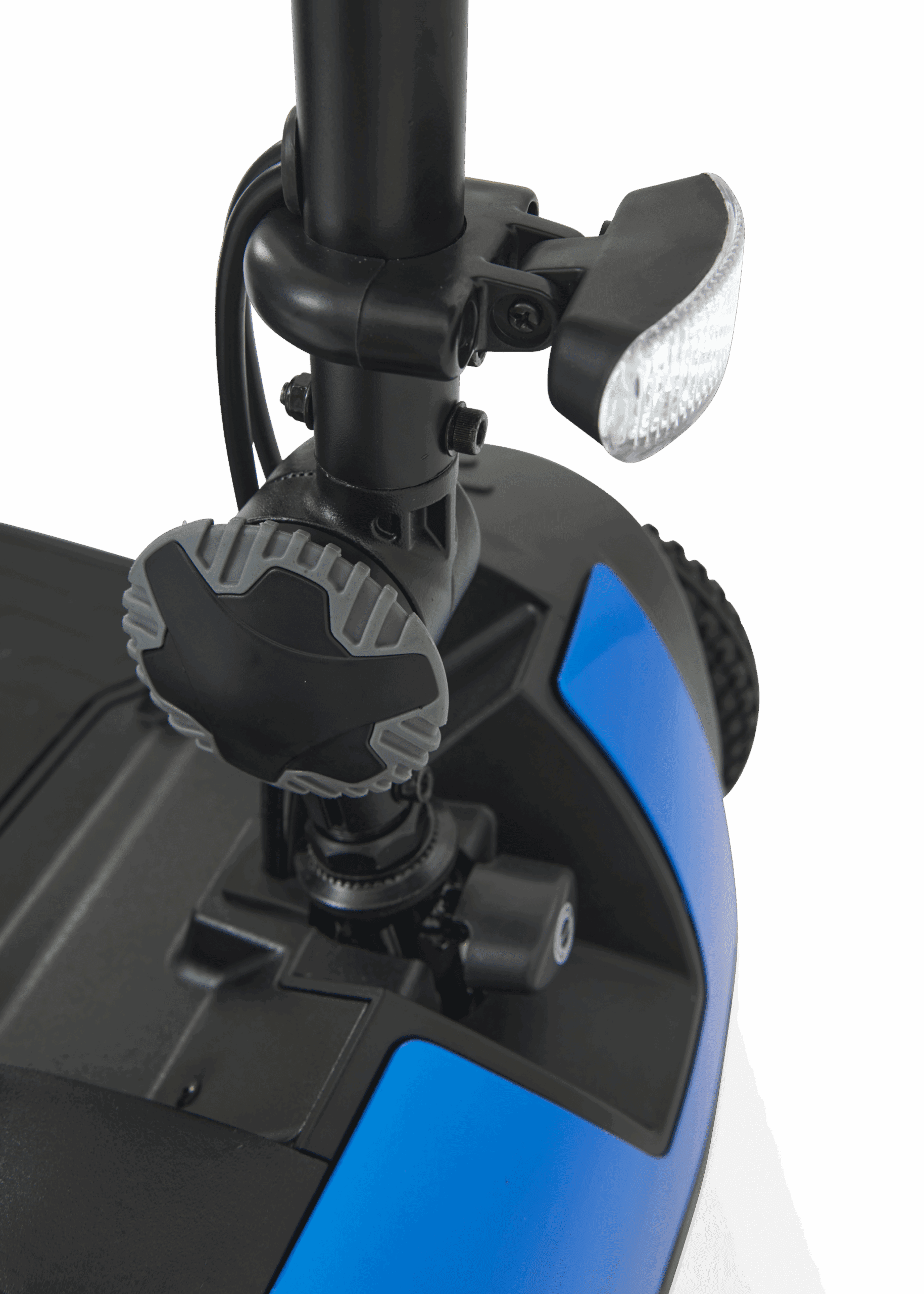 Close-up of the Buzzaround XL 4 Wheel Mobility Scooters handlebar, showcasing a sleek black and blue design. A headlight is attached near the handlebar, with a gear-like adjustment knob visible, highlighting its design and functionality.