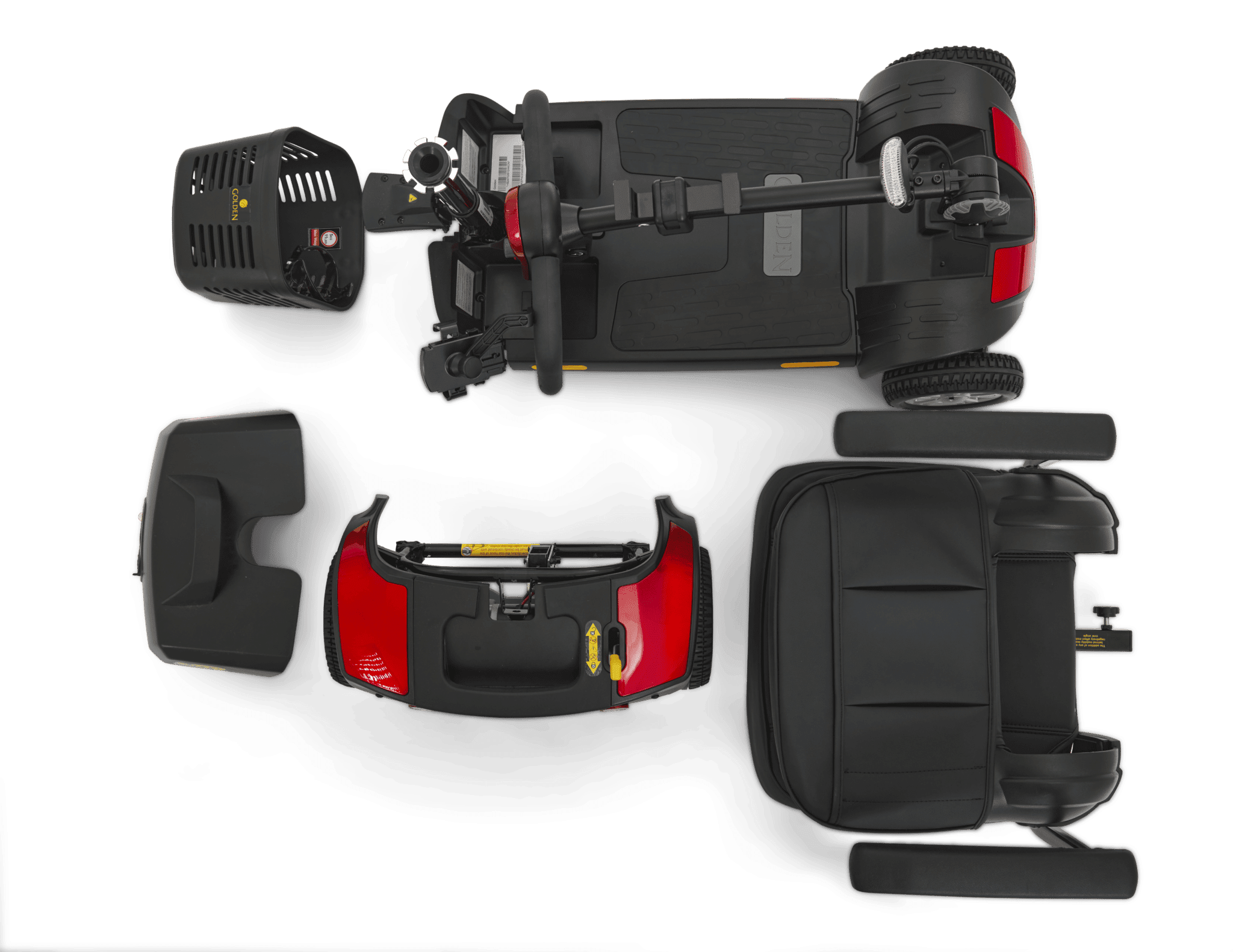 A top view of the black and red Buzzaround XL 4 Wheel Mobility Scooter disassembled on a plain background highlights its modular parts: seat, base, battery, and control panel.