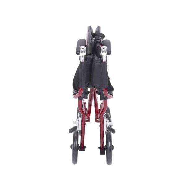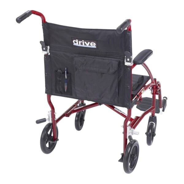 The 19″ Fly Lite Ultra Lightweight Aluminum Transport Chair by Drive Medical, available in a variety of attractive colors, is an ultra light transport chair, weighing only 16.5 lbs. This transport chair comes with a stylish burgundy aluminum frame and black nylon upholstery. It is also durable and easy to clean. Comes standard with a carry pocket on the back rest to easily and securely transport personal items, seatbelt for added safety, and tool free, height adjustable swing away footrests. The deluxe back release allows the back to be folded down easily, making the chair easy to store and transport.