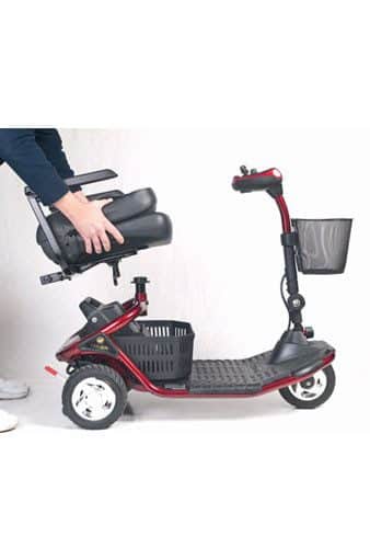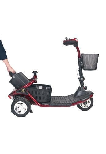 The three-wheel LiteRider™ scooter from Golden features better range, a Delta Tiller standard, more attractive styling and more vibrant colors. A modern tubular frame design supports its 300 lb. weight capacity, and its completely wireless disassembly makes transporting a breeze. The LiteRider GL-110’s 9-inch, black low-profile tires are mounted on high-strength steel rims with shiny hubcaps. Its plush, deep-black vinyl stadium style seat comes with adjustable armrests and a full 360-degree swivel mechanism for getting on and off the scooter easily. You will also appreciate our two storage baskets, one on the tiller and one under the seat. A true beauty, the LiteRider scooter is available in gorgeous, deep shades of red and blue.