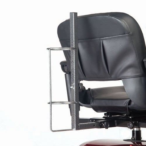 This oxygen tank holder fits C, D and E sized oxygen tanks and fits on the mounting bracket on the back of your Golden scooter. The mounting bracket is standard on the Companions, Buzzaround, LiteRider, Envy and Avenger.