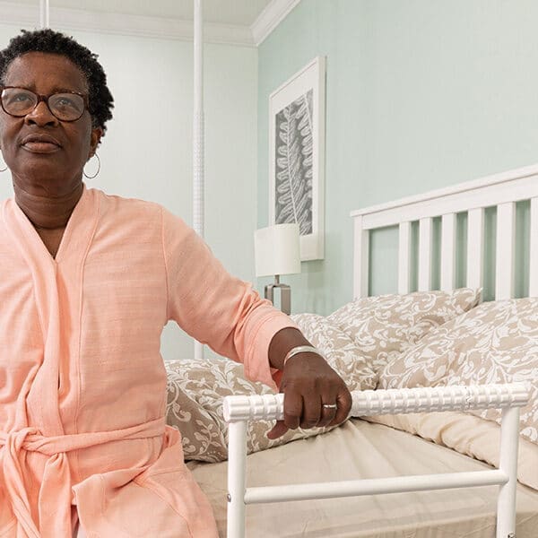 The Hypnos Morpheus Bed Rail featuring SafetyGrip® is a reliable and secure bedrail that provides essential support to patients when getting into and out of their beds, as well as support while transitioning from a lying position to a sitting position. To ensure consistent safety, the bed rail has two height settings with an extra crossbar that helps protect against accidental entrapment. It can fit all bed sizes from twin to king in just minutes with its simple and easy assembly, straps for fastening to the boxspring included. The bedrail also utilizes all surfaces protected with AlphaSan® and is constructed of powder-coated steel for extended durability and easy cleaning. With Hypnos Morpheus Bed Rail featuring SafetyGrip®, you can trust that your patient will get the most secure care possible.