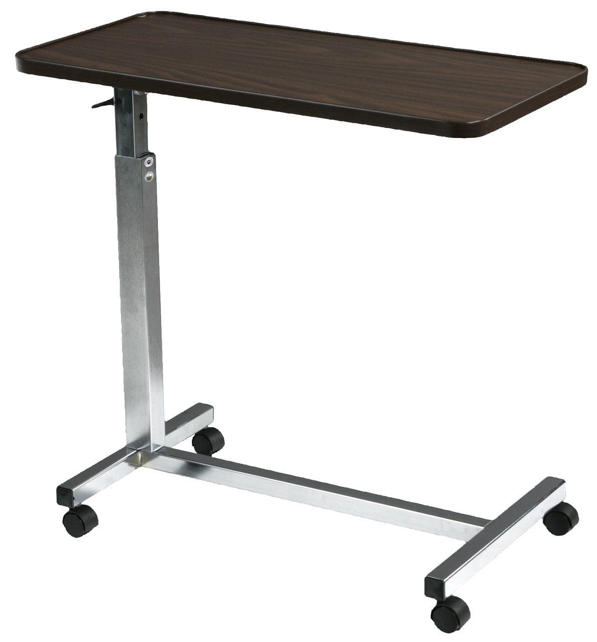 The large, walnut, wood-grain low pressure laminate top provides a roomy surface for this non-tilt overbed table by Drive Medical. The base of the product is highly adjustable; it can be raised with just the slightest upward pressure and adjusts anywhere from 28″ to 45″. The 15″ x 30″ table top locks in place securely the moment the height adjustment handle is released. The strong, steel “H” base and mast are in an attractive chrome plating. 2″ swivel casters allow for easy maneuverability.