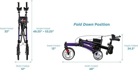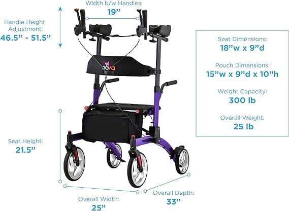 - CONTOURED & PADDED ADJUSTABLE FOREARM CUFFS keep forearms secure and comfortable. They are adjustable to give the perfect fit and feel – and also very durable and easy to clean. Comes with NOVA’s Easy to Use Locking Hand Bakes. The Extra-wide backrest with light padding makes sitting safe and comfortably. Seat handles provide support to sit and stand. Comes with both a front pouch with zipper closure and cane / umbrella holder.