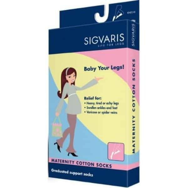 A box of Sigvaris maternity cotton socks featuring a cartoon pregnant woman. The packaging highlights relief for heavy, tired, or achy legs, swollen ankles and feet, and varicose or spider veins. The design is pink and blue.