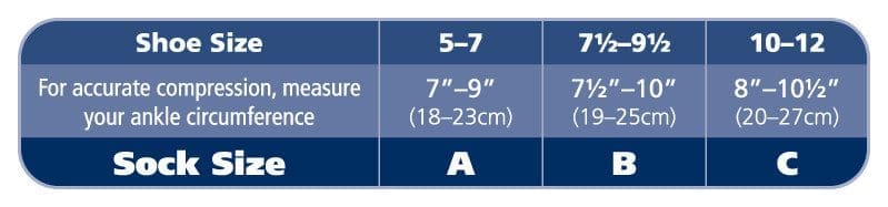 A chart for sock sizes based on shoe size: Size A for shoe size 5-7 (7”-9”/18-23cm), Size B for 7½-9½ (7½”-10”/19-25cm), Size C for 10-12 (8”-10½”/20-27cm). Note advises measuring ankle circumference for accurate compression.