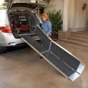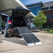 This portable aluminum ramp is great if you are needing to carry a mobility device in your car. Call us to see what sizes we have in stock in our showrooms in Hermitage Tennessee. We can also ship in the continental 48 states.
