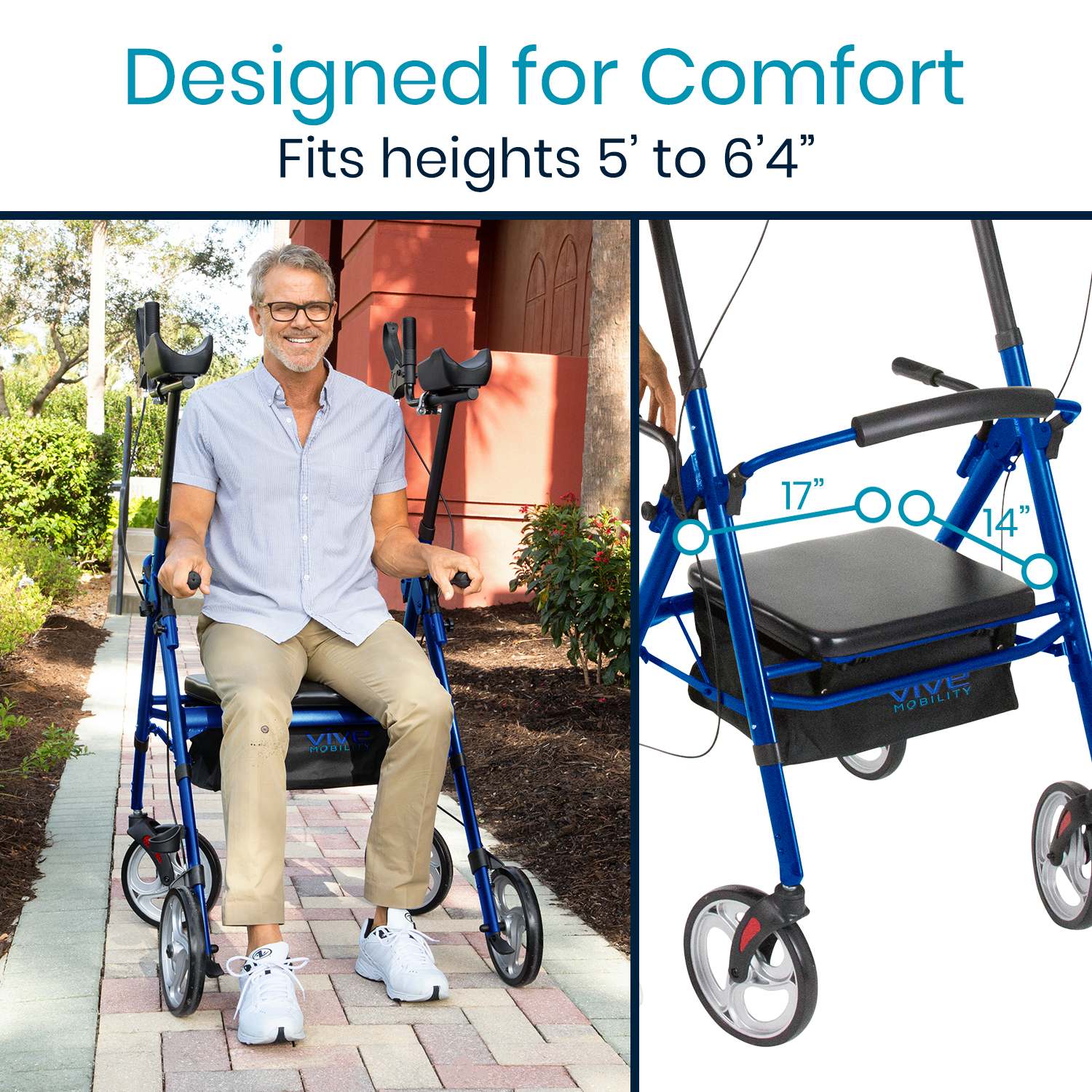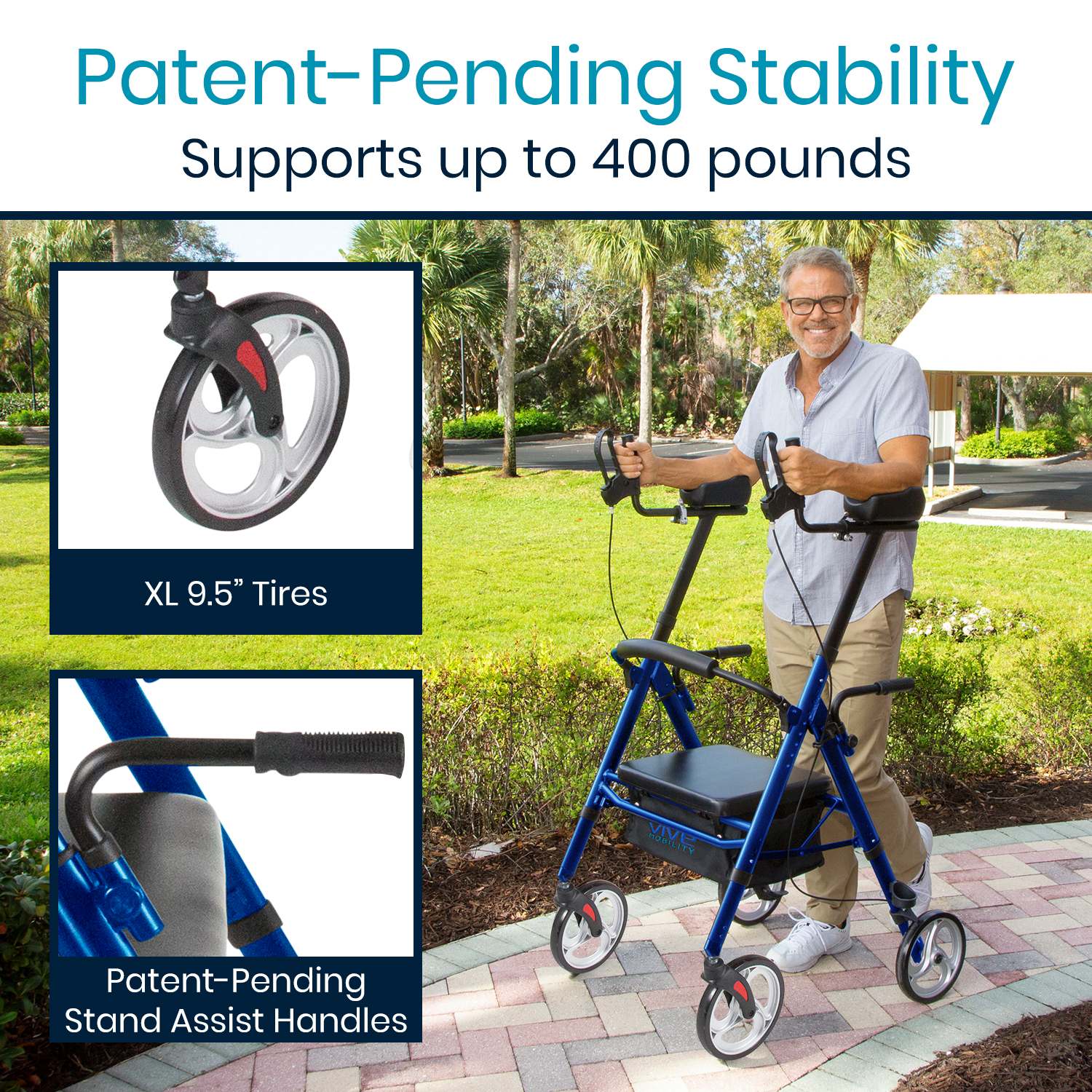 The walker is equipped with 9.5-inch wheels that roll smoothly across a variety of surfaces, including indoor flooring, sidewalks, and outdoor terrain. Whether navigating crowded spaces or enjoying a walk in the park, the Mobility Upright Walker ensures reliable performance and greater ease of movement.