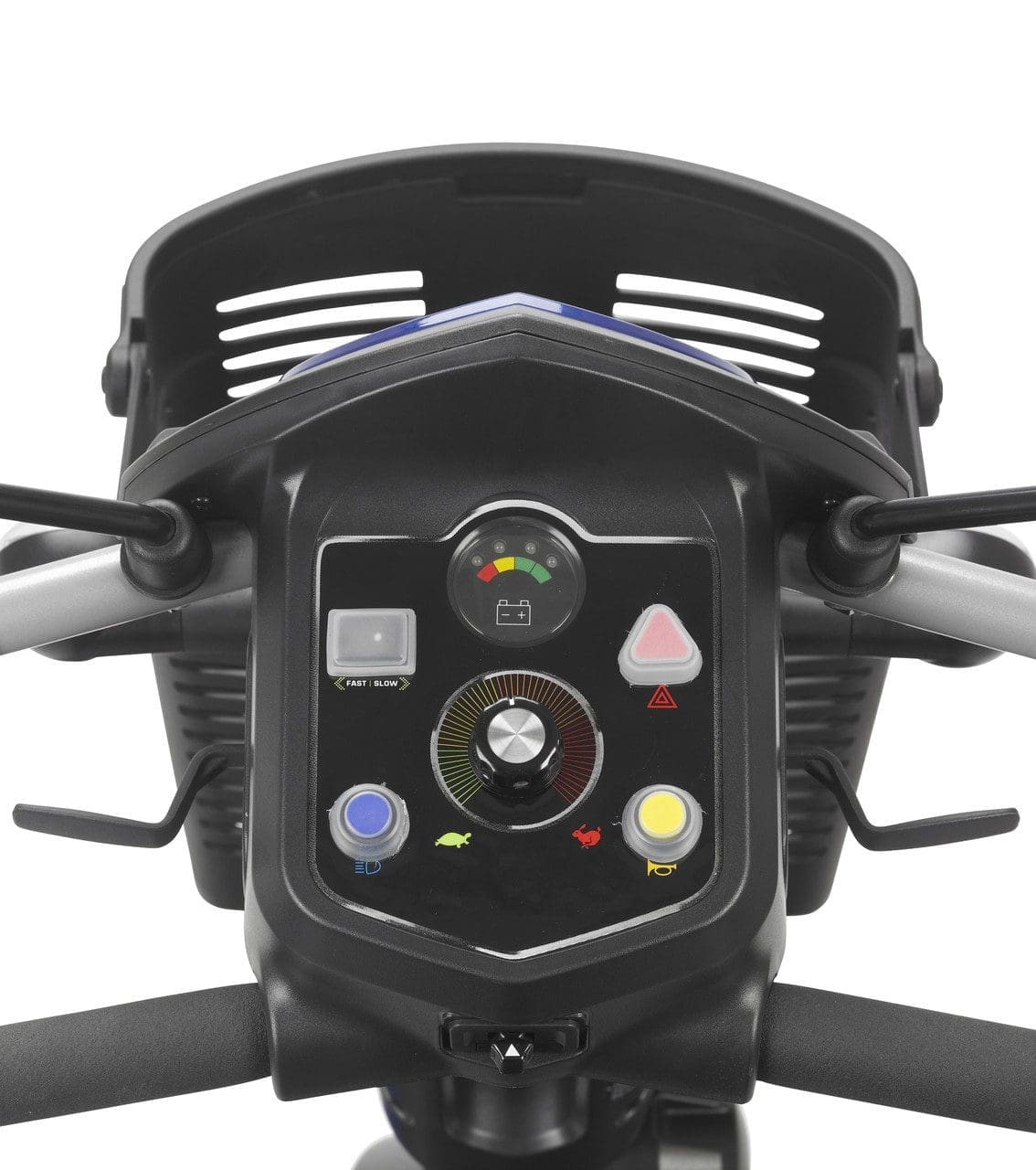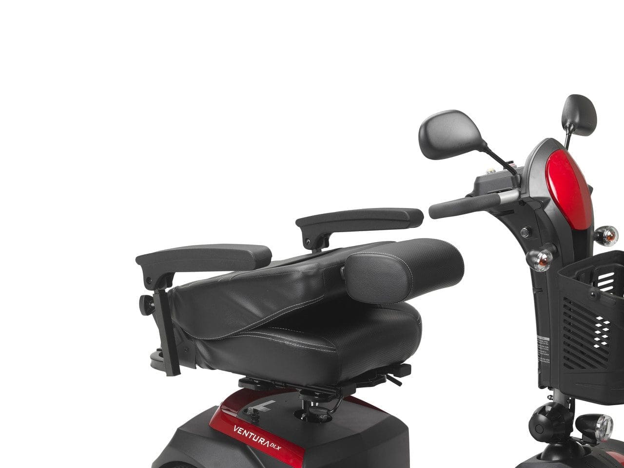 The Ventura 4 Wheel Deluxe Scooter offers a great combination of performance, size, comfort, and styling, making it the perfect mobility option for those seeking the “next step up” from compact/travel scooters. The Ventura’s four-wheel configuration is great for stability and handling on rougher outdoor terrain and the performance makes it perfect for longer trips around the neighborhood or around town. The Ventura 4 Wheel Deluxe Scooter features 36AH batteries for greater power and range, a full safety package including rear view mirrors and additional lighting, and an 18″ wide Captain’s Seat. Users can even change the Ventura’s color with included color change panels in red and blue.